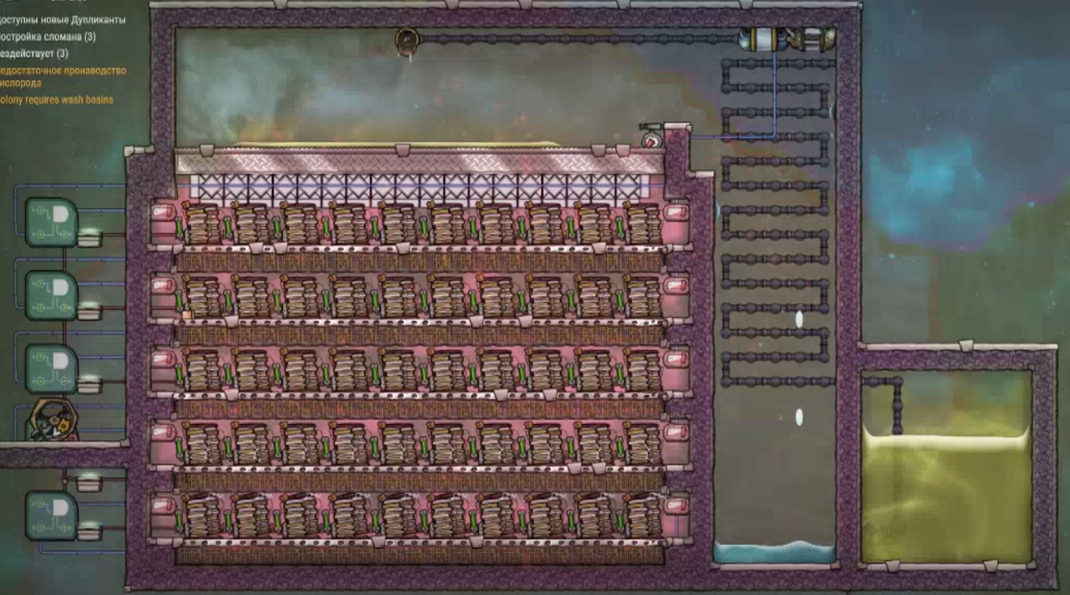 Очень важно, чтобы в клетке, где находится слив было хоть какое-то количество любого газа, тем более чтобы не было вакуума, иначе жидкость затопит и эту клетку, и слив будет заблокирован избыточным давлением. Пример бесконечного резервуара — жидкость не может сломать газопроницаемую плитку и остальные стены. А жидкость может накапливаться бесконечно, так как в одной клетке вместе со сливом есть газ, который никуда не может уйти Ещё один пример эффективного бесконечного резервуара. Жидкость не может сломать двери и шлюзы Ещё один пример бесконечного резервуара. Однако этот вариант не является очень эффективным, стены толщиной в 3 блока занимают слишком много места Способ второй: Очиститель водыПожалуй, этот способ является довольно стандартным по избавлению от грязной воды. Просто поставьте очиститель воды, подведите к нему грязную воду, дальше он все сделает за вас. Данный способ полезен, если у вас не хватает воды, генерируемой, например, прохладным паровым источником, или если вы хотите получить чистую воду, температурой гораздо ниже чем той, которую генерирует гейзер. Способ третий: Гидропонные фермыДанный способ нельзя назвать особо эффективным, однако, если вы вдруг собрались выращивать перечный орешник или камыш, то этот способ вам подойдёт. Конечно, одиночные фермы не потребляют особо много грязной воды, лучше поставить 5-15 штук, в зависимости от ваших потребностей. Способ четвёртый: Синтезатор удобренийТакже грязную воду можно перерабатывать в удобрение и природный газ с помощью синтезатора удобрений. Если вам нужно ускорить рост многих растений или если не хватает выработки природного газа одним гейзером, то этот способ будет полезен. Не очень эффективный способ, так как для синтезатора ещё нужен фосфорит и земля и он выделяет очень маленькое количество природного газа, чтобы запитать один генератор нужны десятки синтезаторов. Способ пятый: Пар из водыГрязную воду можно нагреть до 124°C, после чего она превратится в пар и, после конденсации образуется уже чистая вода. За счёт высоких температур также избавляемся от микробов. Если использовать установку на аккумуляторах, которые вырабатывают постоянно тепло (6,25 Вт), то можно нагреть их до 124°C (из золотой амальгамы порог перегрева +50°C).
