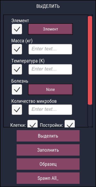 Спавнер — позволяет заспавнить случайных дубликантов, еду, одежду и экзокостюмы, растения и семена, животных и их яйца.