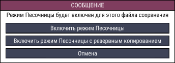 Включение песочницы необратимо для этого файла сохранения, поэтому игра спросит - включить песочницу немедленно или сначала сделать резервное сохранение. Выберите что-нибудь по своему усмотрению.