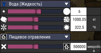 Кисть — заполняет небольшую область выбранным элементом с выбранными параметрами (масса, температура, тип и количество микробов).